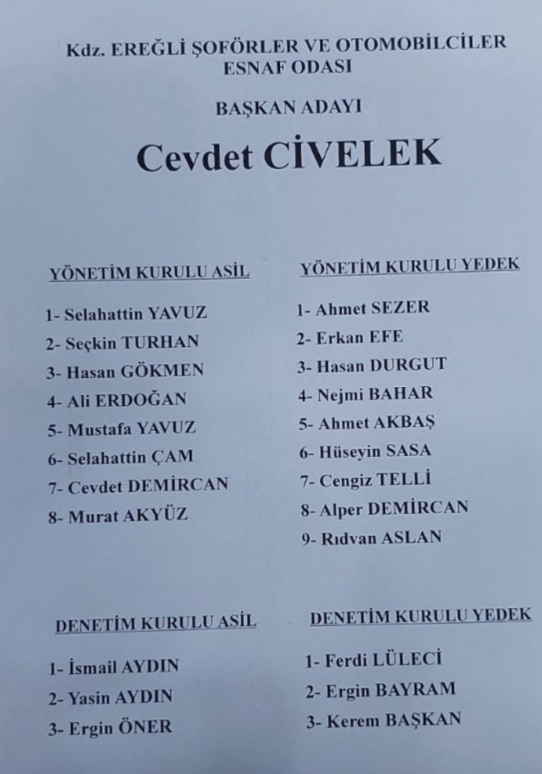 Görev süresi boyunca şoför esnafının sorunlarını yakından takip eden, esnafla birebir temas kuran ve çözüm odaklı çalışmalarıyla öne çıkan Cevdet Civelek, yeni dönemde de istikrarı ve güçlü temsili esas alan bir anlayışla yoluna devam etmeyi hedefliyor. Oluşturulan geniş katılımlı ve tecrübeli kadro, oda camiasında memnuniyetle karşılanırken, kongrenin birlik ve beraberlik içerisinde geçmesi bekleniyor.