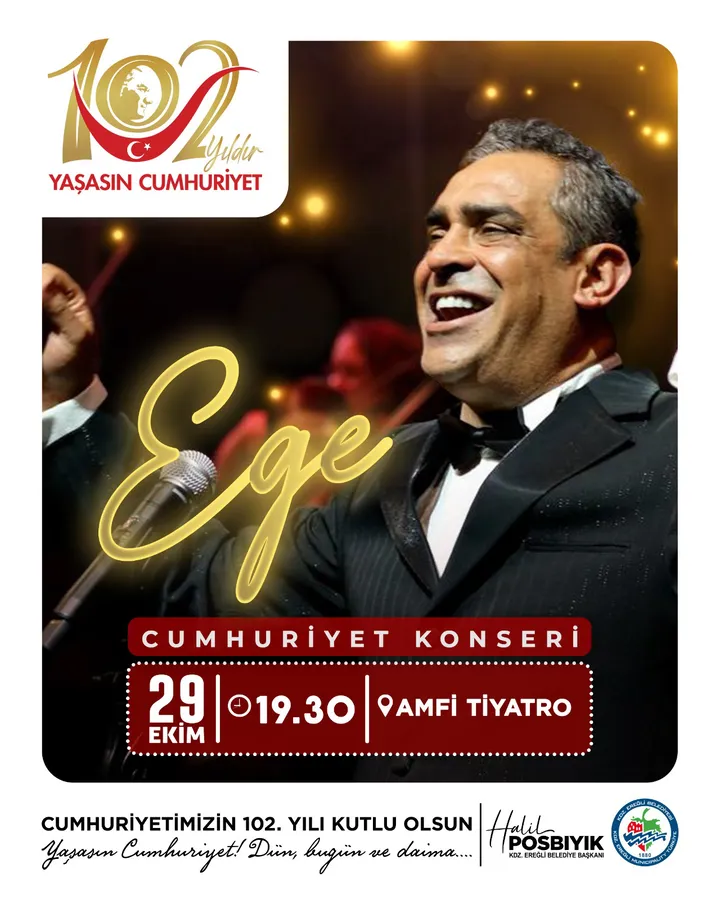 Cumhuriyetin kazanımlarını ve değerlerini gelecek kuşaklara aktarma sorumluluğuyla her yıl olduğu gibi bu yıl da anlamlı bir kutlama programı hazırlayan Kdz. Ereğli Belediyesi, 29 Ekim Cumhuriyet Bayramı etkinlikleri kapsamında düzenleyeceği “Cumhuriyet Konserleri” ve “Cumhuriyet Yürüyüşü” ile tüm vatandaşları birlik, beraberlik ve coşku içinde Cumhuriyetimizin ilanının 102. yıl dönümünü kutlamaya davet ediyor.