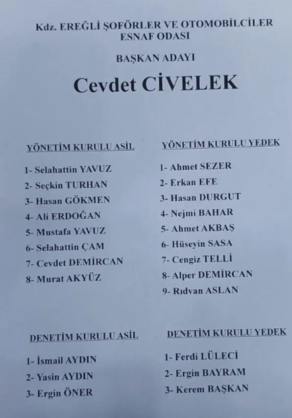 Görev süresi boyunca şoför esnafının sorunlarını yakından takip eden, esnafla birebir temas kuran ve çözüm odaklı çalışmalarıyla öne çıkan Cevdet Civelek, yeni dönemde de istikrarı ve güçlü temsili esas alan bir anlayışla yoluna devam etmeyi hedefliyor. Oluşturulan geniş katılımlı ve tecrübeli kadro, oda camiasında memnuniyetle karşılanırken, kongrenin birlik ve beraberlik içerisinde geçmesi bekleniyor.